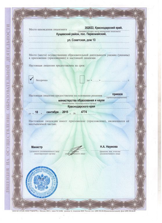 | Адрес местонахождения образовательной организации* | 352022, Краснодарский край, Кущевский р-н, Первомайский п, Советская ул, дом № 13 |