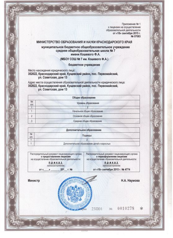 - Места осуществления образовательной деятельности по дополнительным профессиональным программам: МБОУ СОШ №7 им.Кошевого Ф.А. поселок Первомайский, ул.Советская 13