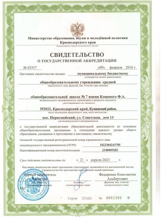 | Сокращенное наименование образовательной организации* | МБОУ СОШ №7 им. Кошевого Ф.А. |